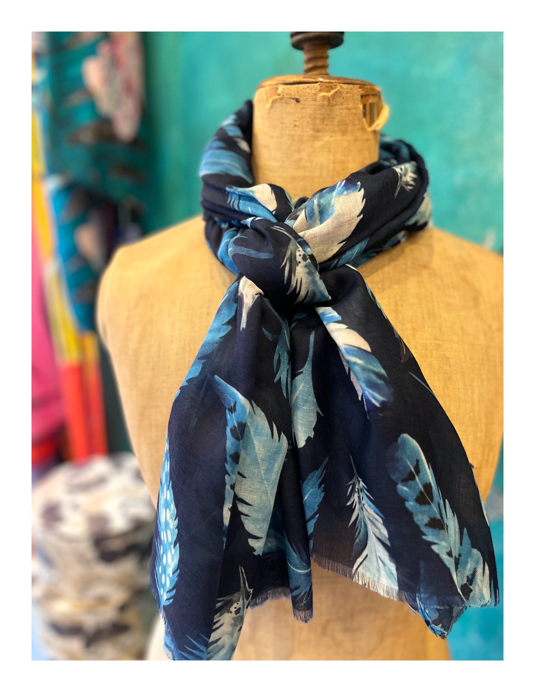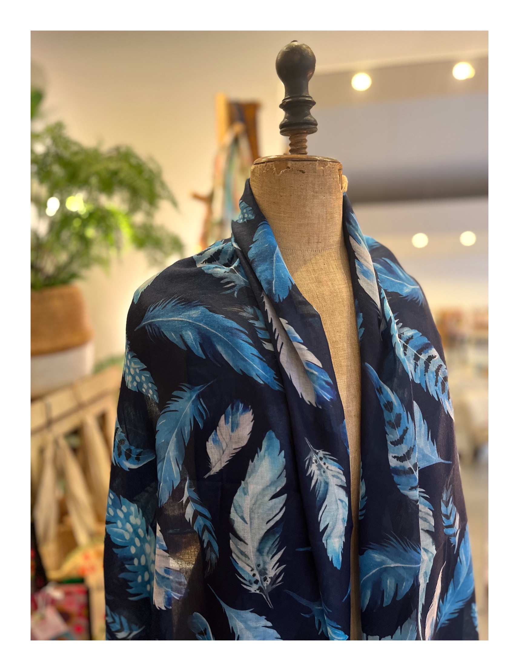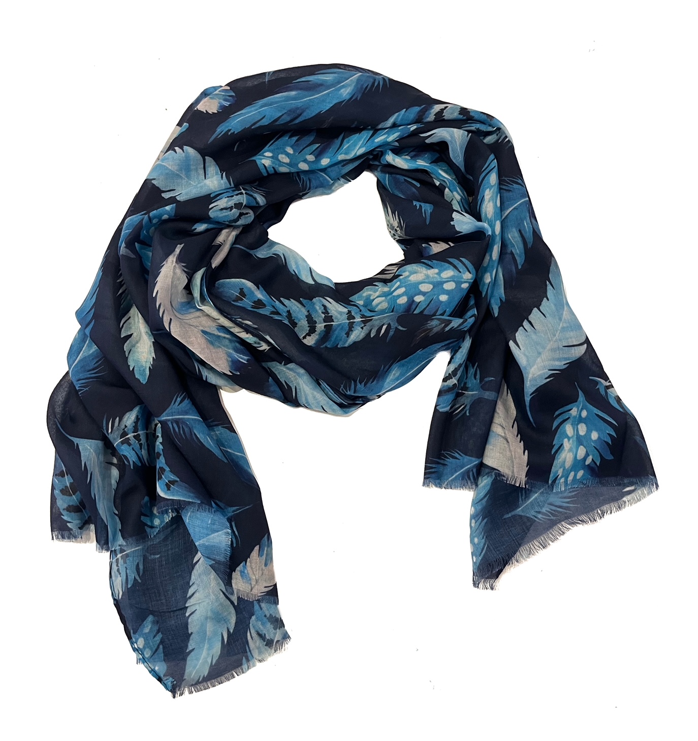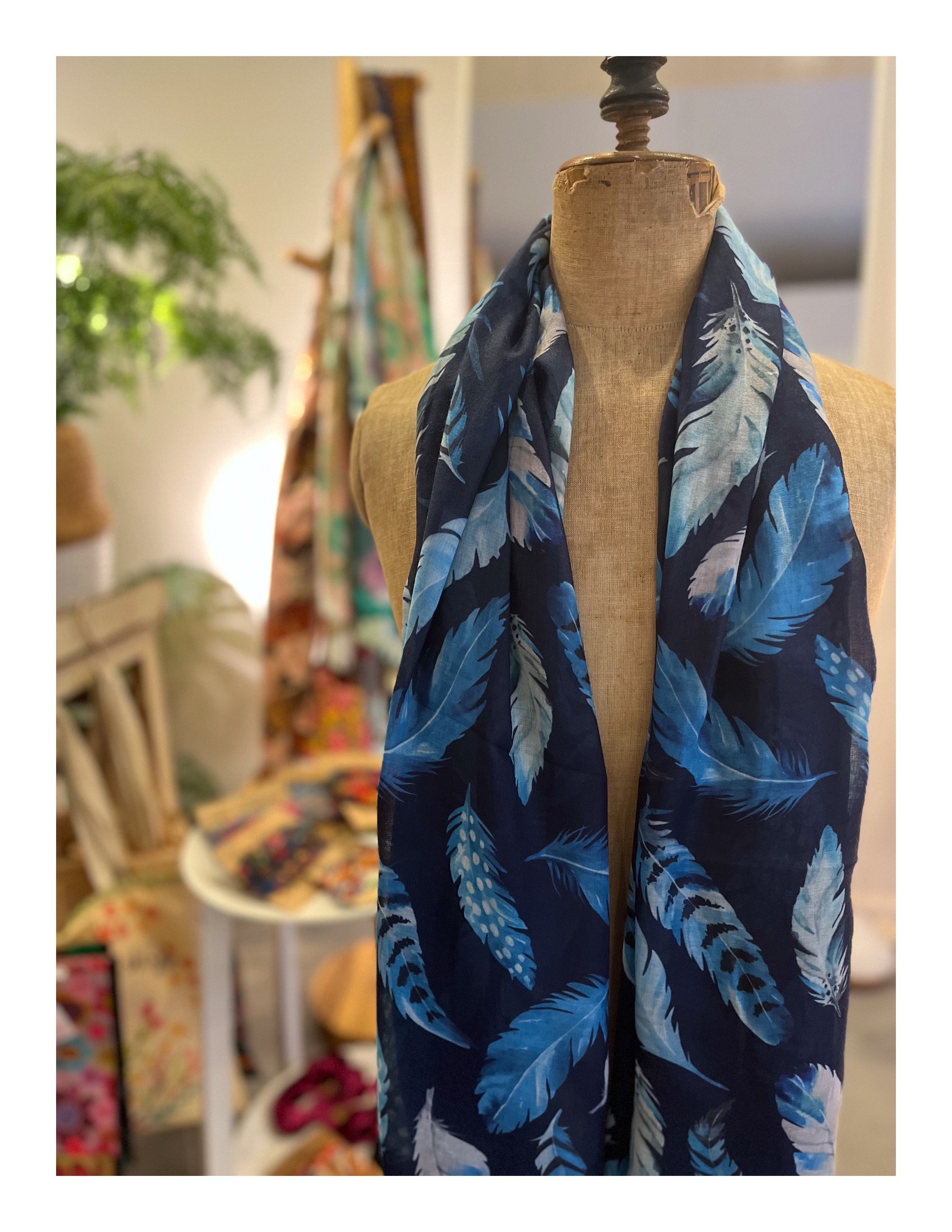 Blauw sjaaltje met veren. Dit sjaaltje heeft zoveel tinten blauw dat het altijd wel past bij je vestje, blouse of colbert.