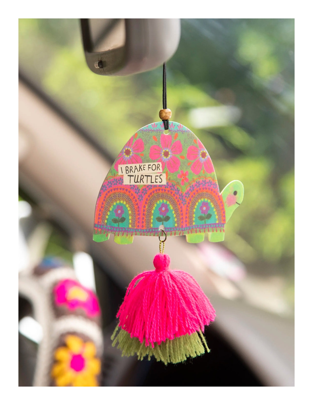 - het schildpadje met quote is ongeveer 7 x 10 cm en met de pompons erbij is de Air Freshener totaal ongeveer 22 cm lang