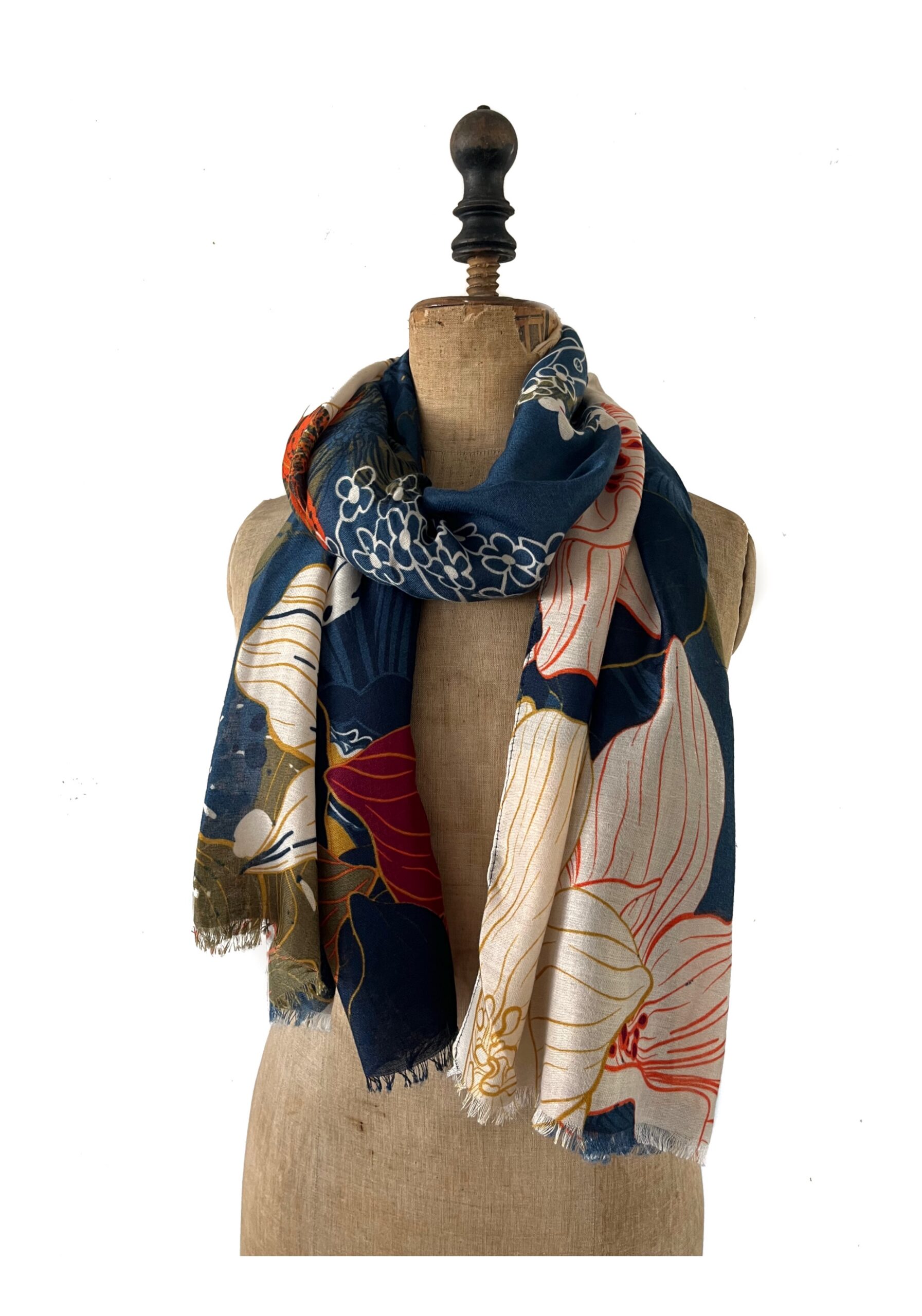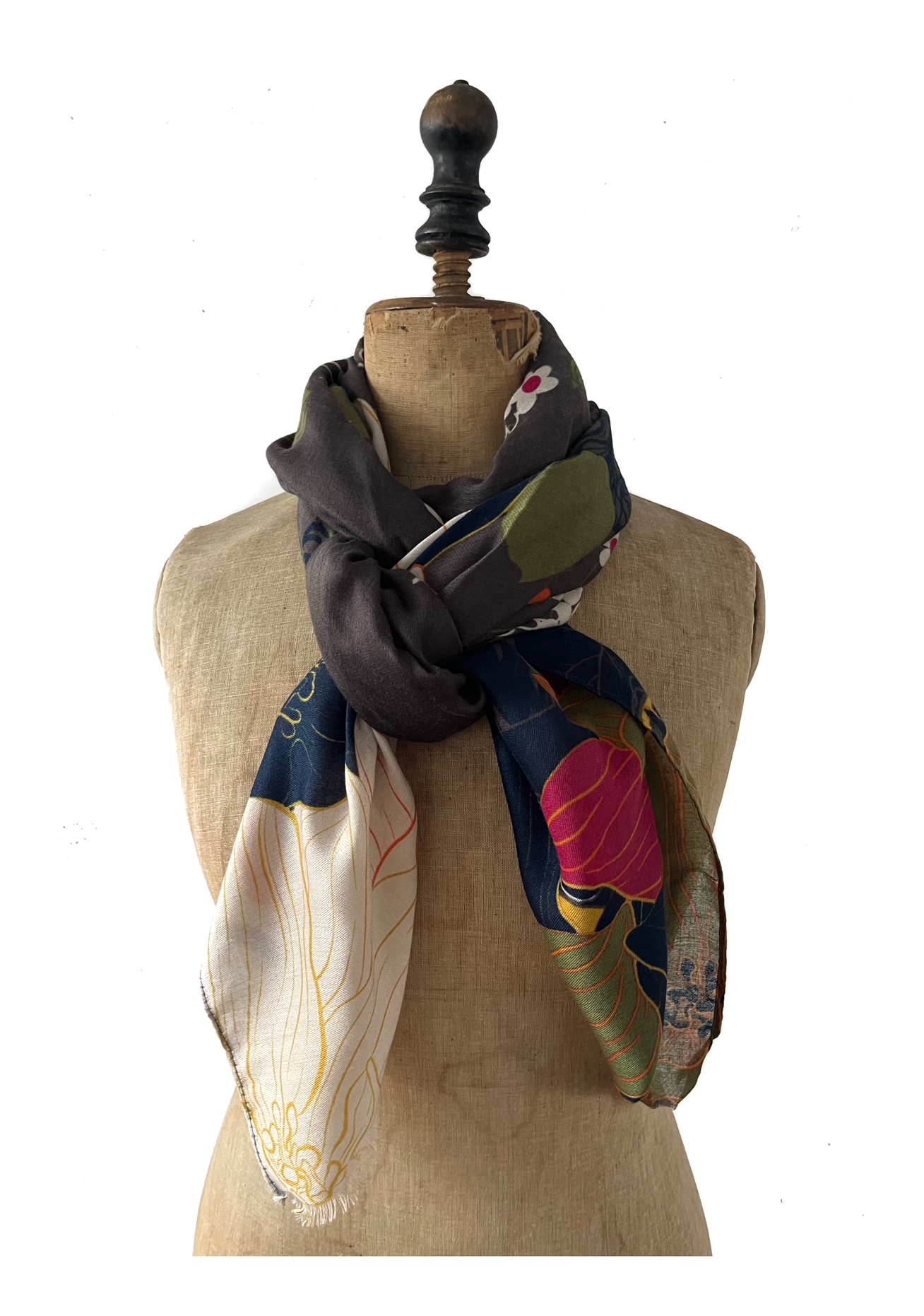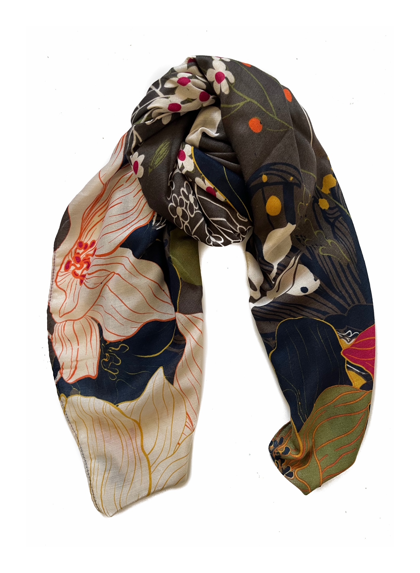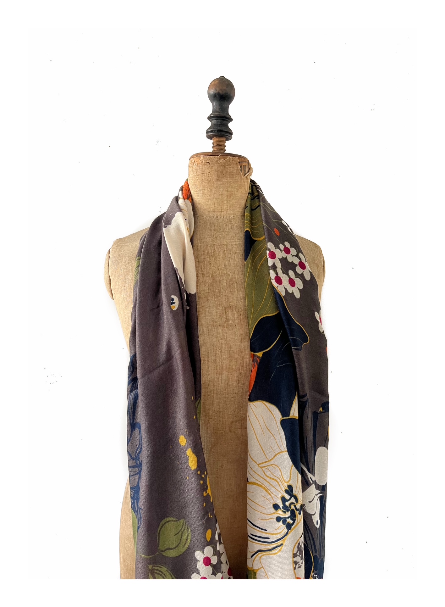 De ondergrond is grijs ( geen koele kleur grijs maar ‘klei grijs’, wat we ook wel taupe noemen) met hierbij een patroon met diverse bloemen en takken in verschillende stijlen en kleuren, waaronder grote, gedetailleerde bloemen in wit, kaki groen, bordeaux rood, blauw en een snuf oranje, afgewisseld met fijnere, witte bloesem achtige structuren en enkele abstracte spetters in oker geel. Een rijk en levendige, enigszins exotisch of botanisch motief. De ondergrond van deze shawl is grijs, gecombineerd met een witte blouse geeft dit een gekleed en hip effect.