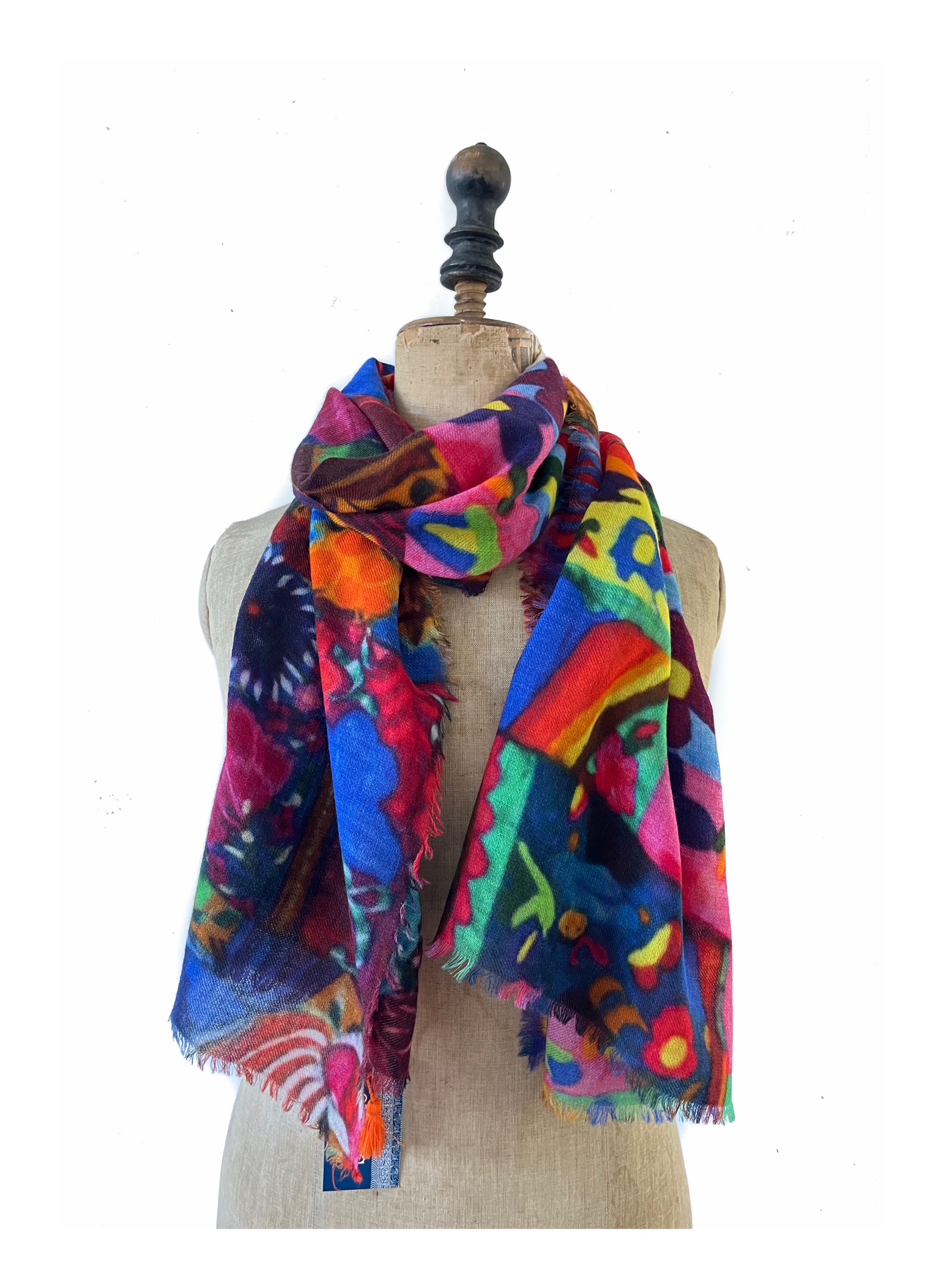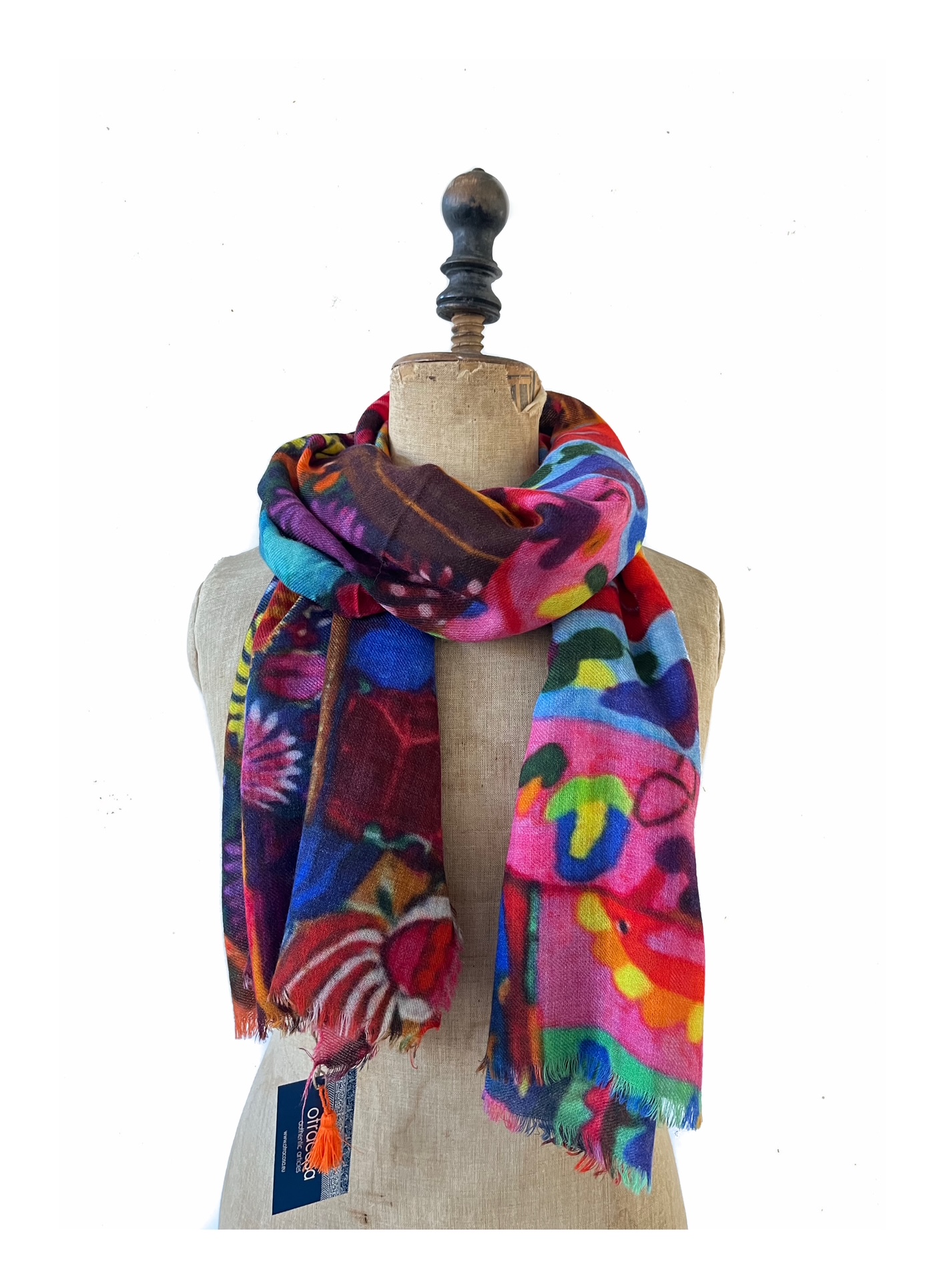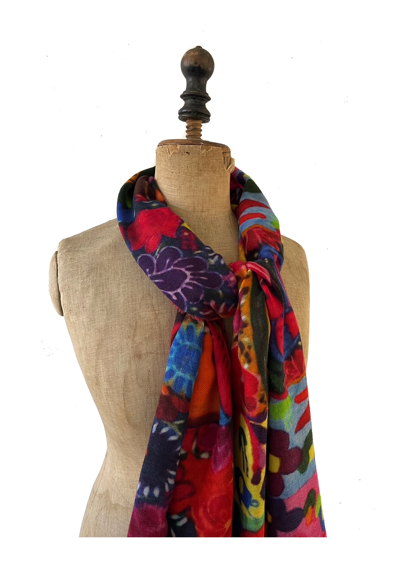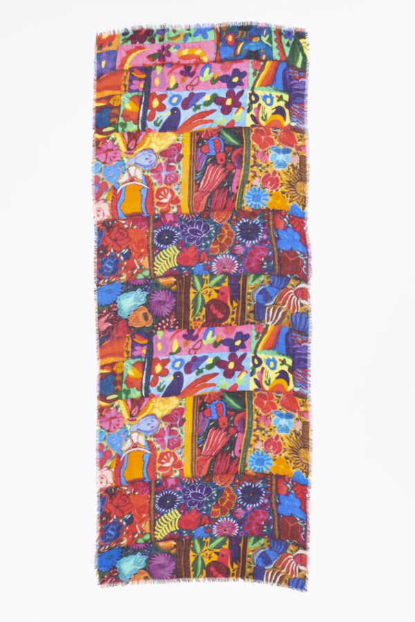 De patchwork bloemen sjaal van Otracosa is super vrolijk, alle kleuren van de regenboog vind je terug in dit dessin. Combineren lukt wel er zit altijd een kleur in die goed past bij je truitje of blouse.
